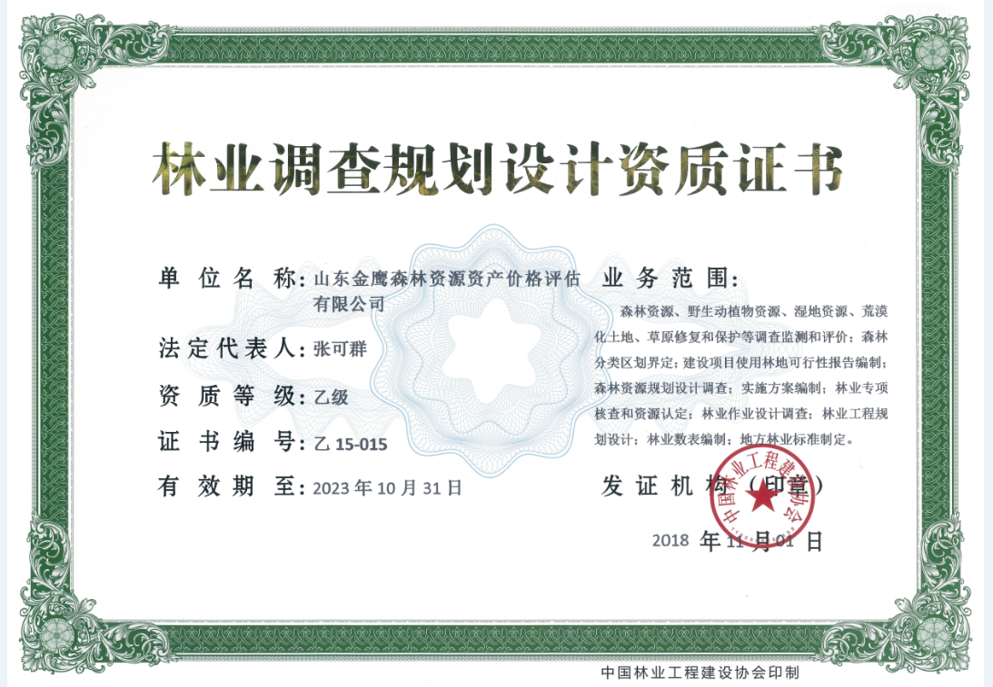公司現(xiàn)擁有國(guó)內(nèi)林業(yè)工程建設(shè)協(xié)會(huì)頒發(fā)的《林業(yè)調(diào)查規(guī)劃設(shè)計(jì)資質(zhì)證書(shū)》乙級(jí)資質(zhì)和山東省價(jià)格協(xié)會(huì)頒發(fā)的《價(jià)格評(píng)估機(jī)構(gòu)登記資格證書(shū)》,是省內(nèi)林業(yè)規(guī)劃設(shè)計(jì)和森林資源資產(chǎn)評(píng)估領(lǐng)域知名的咨詢(xún)服務(wù)機(jī)構(gòu)。